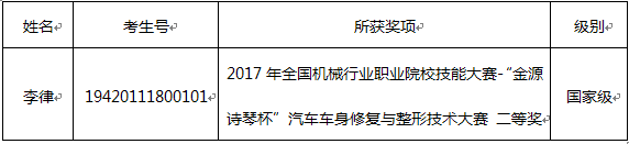 根据鄂教职成[2018]3号文件规定,凡获得省级及以上职业院校技能大赛三等奖及以上奖项,或具有高级工及以上职业资格、或获得县级以上劳动模范(含同等荣誉)称号,或在服役期间荣立三等功及以上的退役士兵,可直接向学校提出申请,免试录取。经beat365官网单独招生领导小组办公室研究决定对李律同学参加beat365官网2019年单独招生考试的免试资格予以公示,公示时间为2019年3月5日-2019年3月11日,公示期内如有异议,请拨打电话027-87378091。