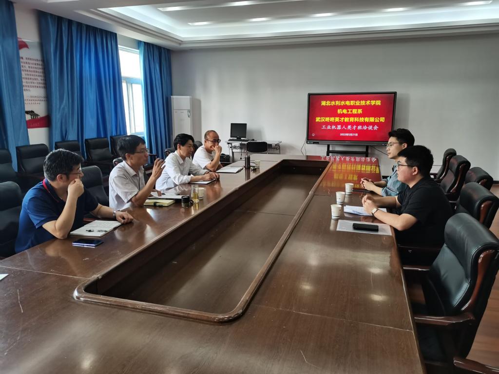 郝玉龙)5月21日,beat365官网机电工程系在南湖校区机电楼会议室召开“工业机器人英才班”订单培养洽谈会,武汉咚咚英才教育科技有限公司、机电工程系负责人及工业机器人专业负责人参加洽谈。