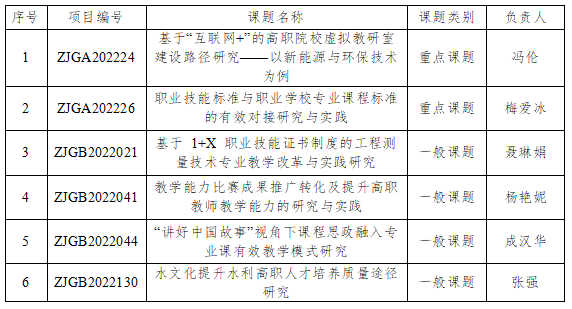 (冯伦)日前,从湖北省职业技术教育学会《关于公布2022年度湖北省职业技术教育学会科学研究课题立项评审结果的通知》(鄂职教学会〔2022〕6号)获悉,beat365官网申报的6项科学研究课题获批立项,名单如下:
