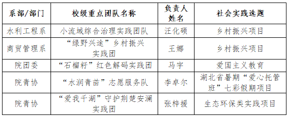 根据学院《大学生社会实践活动管理办法(鄂水电院学〔2025〕3 号)》,为更好地发挥实践育人作用、有组织地开展社会实践活动,前期院团委广泛动员各学院积极组建社会实践团队。经自主申报、系部推荐和学校评审,2025年暑期社会实践校级重点团队共立项5支。