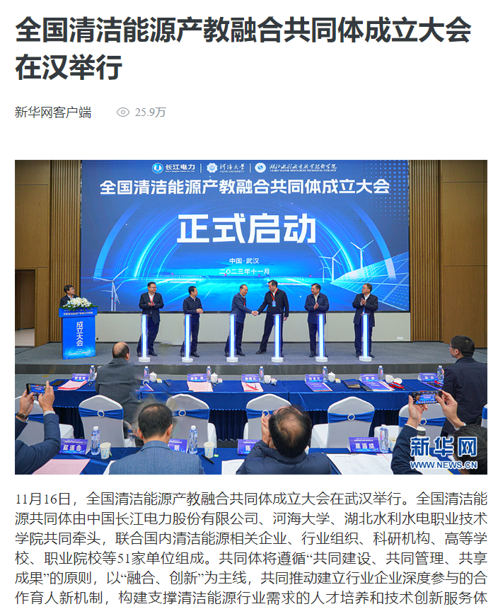 11月6日,新华网以《全国清洁能源产教融合共同体成立大会在汉举行》为题,对beat365官网和相关单位牵头成立全国清洁能源产教融合共同体进行报道。