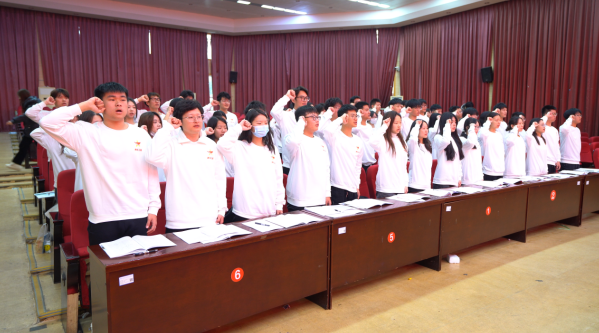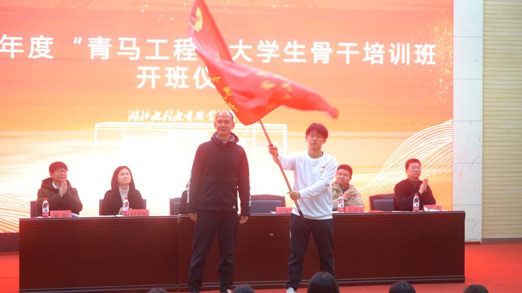 随后学工处负责人为本期青马班授旗,学员代表用力挥舞炽红鲜艳的班旗,彰显了水院学子坚定理想信念、传承红色精神的决心。全体青马班学员庄严宣誓,铿锵有力的誓词表达了坚定不移听党话、跟党走,争做新时代好青年的理想信念。