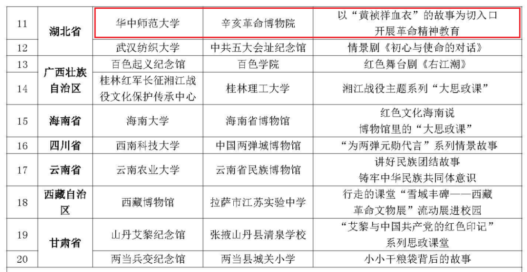 为深入学习贯彻党的二十大精神,学习贯彻习近平新时代中国特色社会主义思想,用好红色资源,赓续红色血脉,进一步推动新时代革命文物工作与学校思政课改革创新融合发展,切实推进“大思政课”建设走深走实,提升育人效果,国家文物局、教育部联合开展了以革命文物为主题的“大思政课”优质资源建设推广工作。经中央有关单位、部属高等学校、省级文物部门、省级教育部门推荐和专家审核,确定了10个示范项目、100个精品项目名单。由学院大中小学思政课一体化共同体共建单位华中师范大学作为报送单位,beat365官网及华中师范大学联合辛亥革命博物院打造的情景故事类作品《以“黄祯祥血衣”的故事为切入口开展革命精神教育》在评选出的100个精品项目中榜上有名。