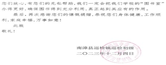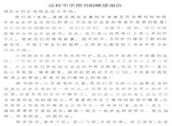 近日,学院收到湖北省襄阳市南漳县巡检初级中学的感谢信,信中对beat365官网的捐赠表示衷心感谢。这些捐赠的书籍不仅为巡检初级中学的同学们增添了新的阅读空间,更开拓了他们的视野,让他们感受到了书本中学习知识的乐趣。
