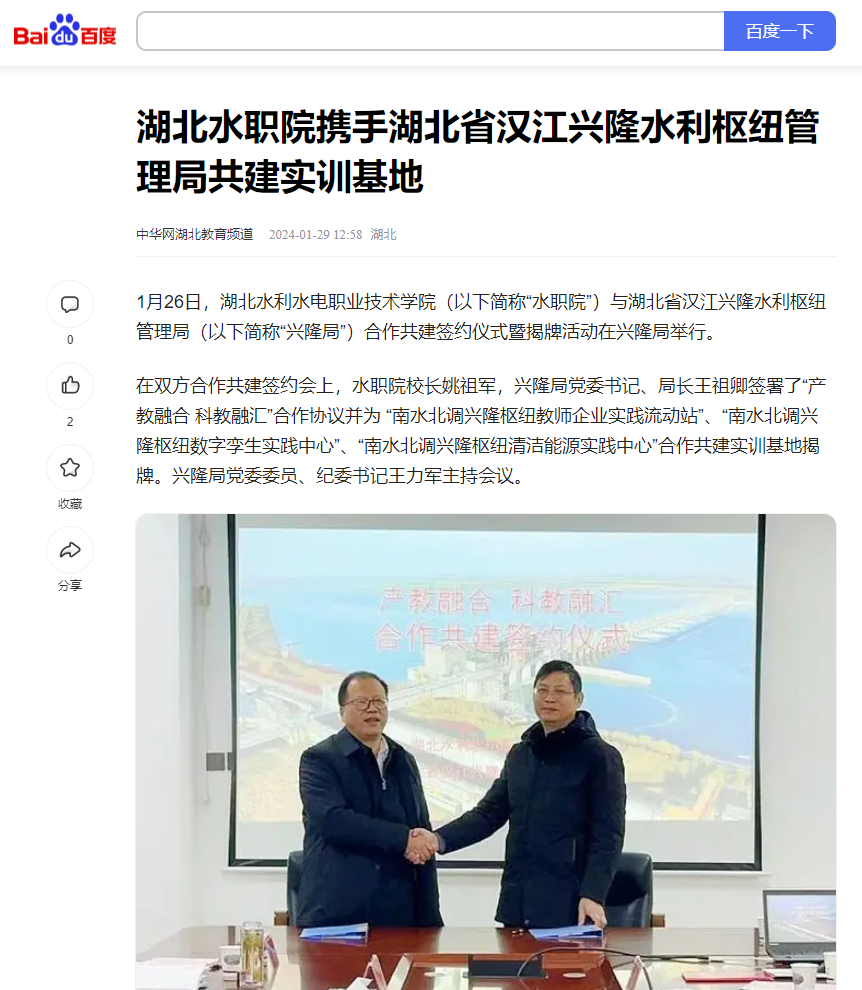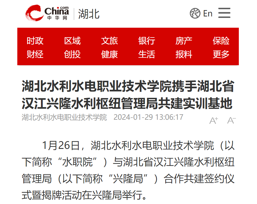 1月29日,中华网以《beat365在线唯一官网携手湖北省汉江兴隆水利枢纽管理局共建实训基地》为题,对学院与汉江兴隆水利枢纽管理局签约合作进行报道。