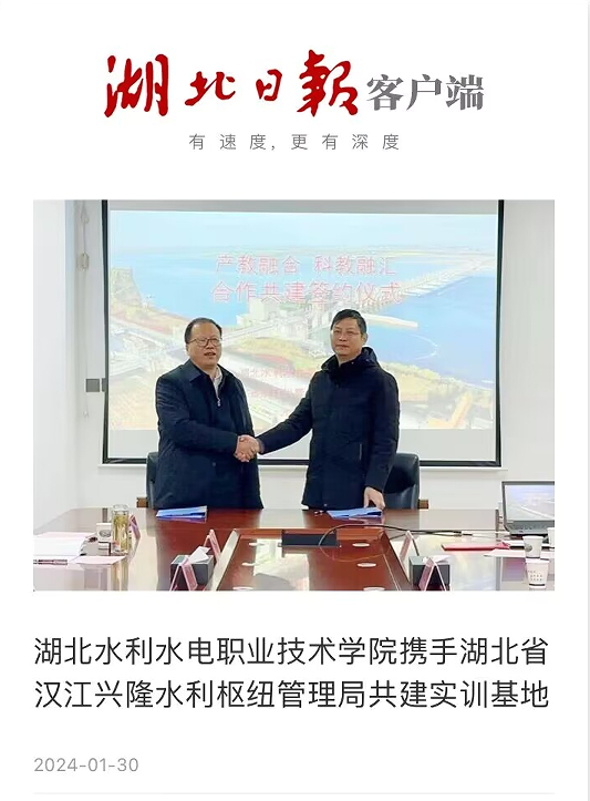 1月30日,《湖北日报》以《beat365在线唯一官网携手湖北省汉江兴隆水利枢纽管理局共建实训基地》为题,对学院与汉江兴隆水利枢纽管理局签约合作进行报道。