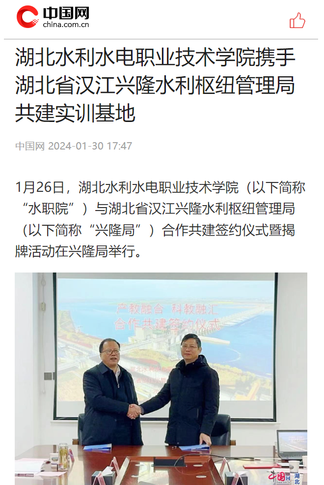 1月30日,中国网以《beat365在线唯一官网携手湖北省汉江兴隆水利枢纽管理局共建实训基地》为题,对学院与汉江兴隆水利枢纽管理局签约合作进行报道。