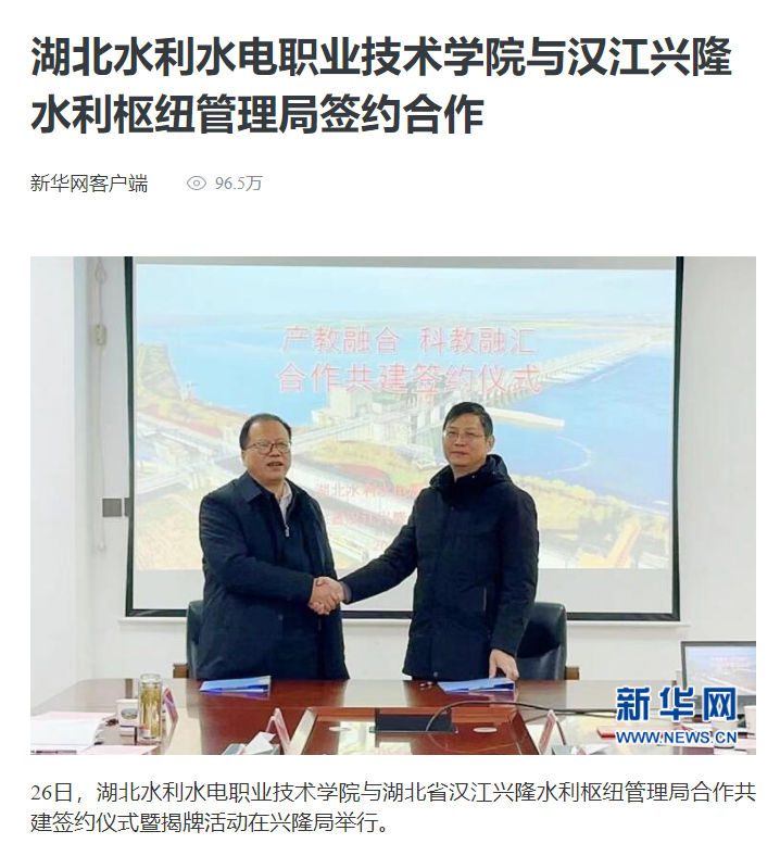 1月30日,新华网以《beat365在线唯一官网与汉江兴隆水利枢纽管理局签约合作》为题,对学院与汉江兴隆水利枢纽管理局签约合作进行报道。