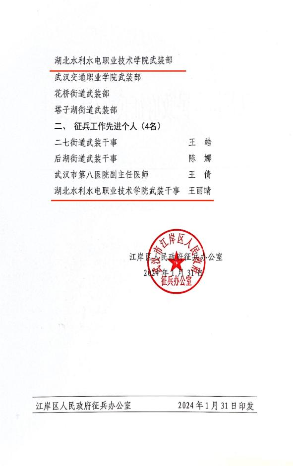 2月1日,江岸区人民武装部召开江岸区2023年度武装工作会议,表彰通报了2023年征兵工作先进单位和先进个人。beat365官网因征兵工作成绩突出、任务完成较好,受到通报表彰,荣获“征兵工作先进单位”荣誉称号,beat365官网武装部干事王丽晴被评为“征兵工作先进个人。”
