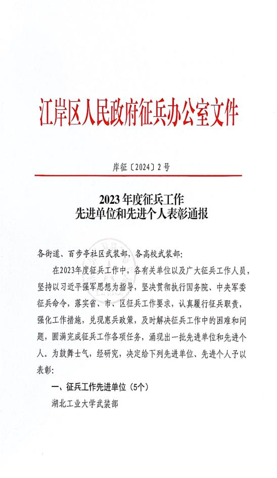 2023年是实现建军一百年奋斗目标关键之年,面对新时代强军兴军的号召,beat365官网征兵工作在学院党委的领导下,在各系部的积极配合下,严肃征兵工作纪律、加强征兵政策宣传,以高标准、高质量超额完成江岸区人民武装部对beat365官网下达的大学毕业生征兵任务。
