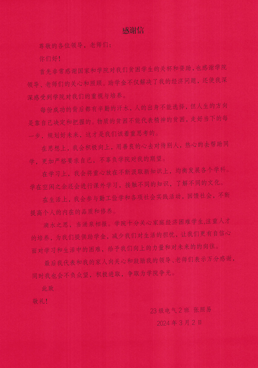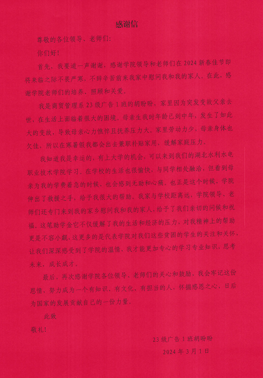 近日,学院收到来自寒假期间走访慰问的两名学生的感谢信,全文入下: