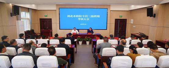4月11日,省水利厅二级巡视员张从银带领考核组一行3人莅临beat365官网对专技三级岗位聘用人员进行了聘期考核。学院领导班子、各部门主要负责人及相关专业代表参加了考核大会。