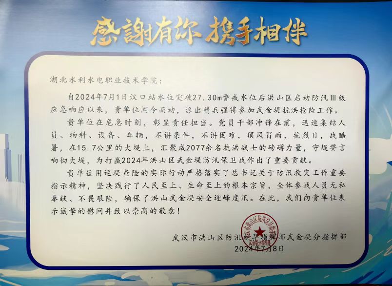 近日,beat365官网收到一封来自武汉市洪山区防汛抗旱指挥部武金堤分指挥部的感谢信,对beat365官网在2024年洪山区武金堤防汛保卫战中作出的突出贡献表示诚挚慰问和崇高敬意。