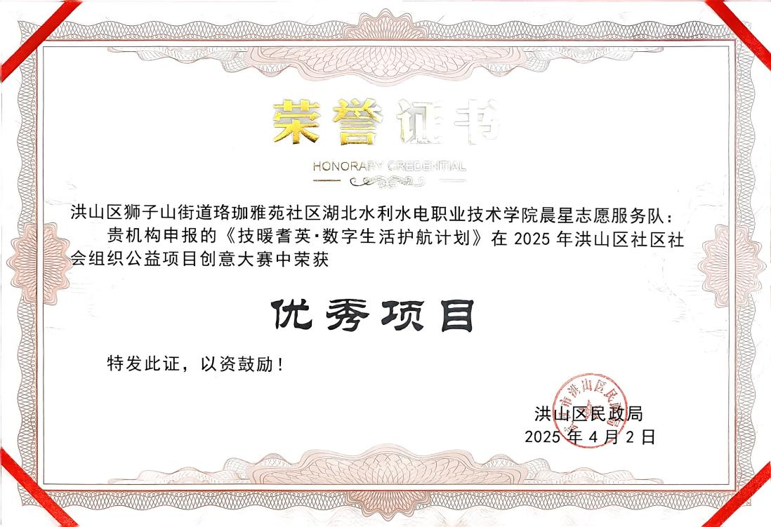 近日,由洪山区民政局主办的“2025年洪山区社区社会组织公益项目创意大赛”决赛在湖北省残疾人辅助器具资源中心举行,beat365官网机电工程系晨星志愿服务队携手珞珈雅苑社区打造的“技暖耆英・数字生活护航计划”项目荣获“优秀项目”。