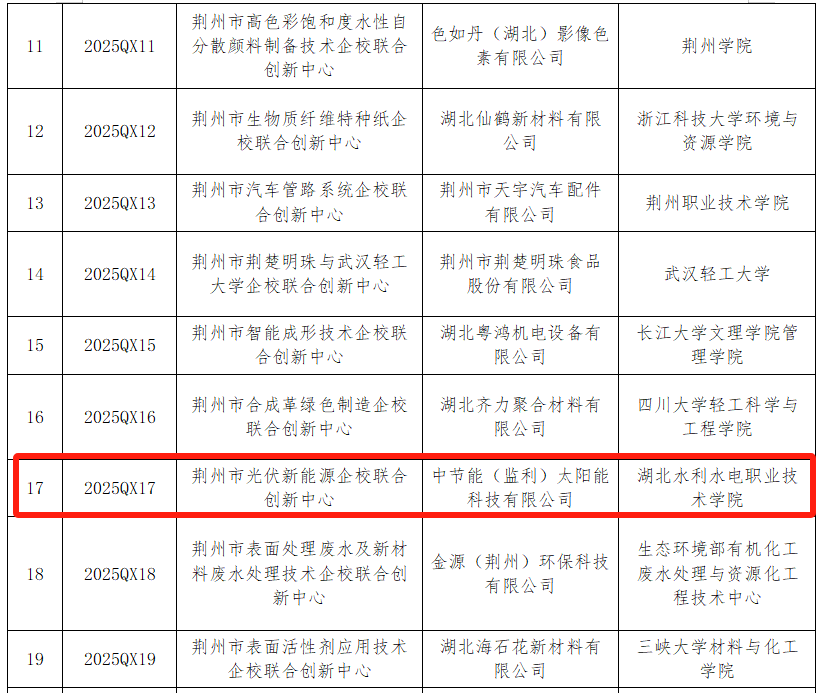 根据《荆州市科学技术局关于备案一批市级企校联合创新中心备案的通知》(荆科技发〔2025〕15号),学院与中节能(监利)太阳能科技有限公司联合申报的荆州市光伏新能源企校联合创新中心顺利通过备案。