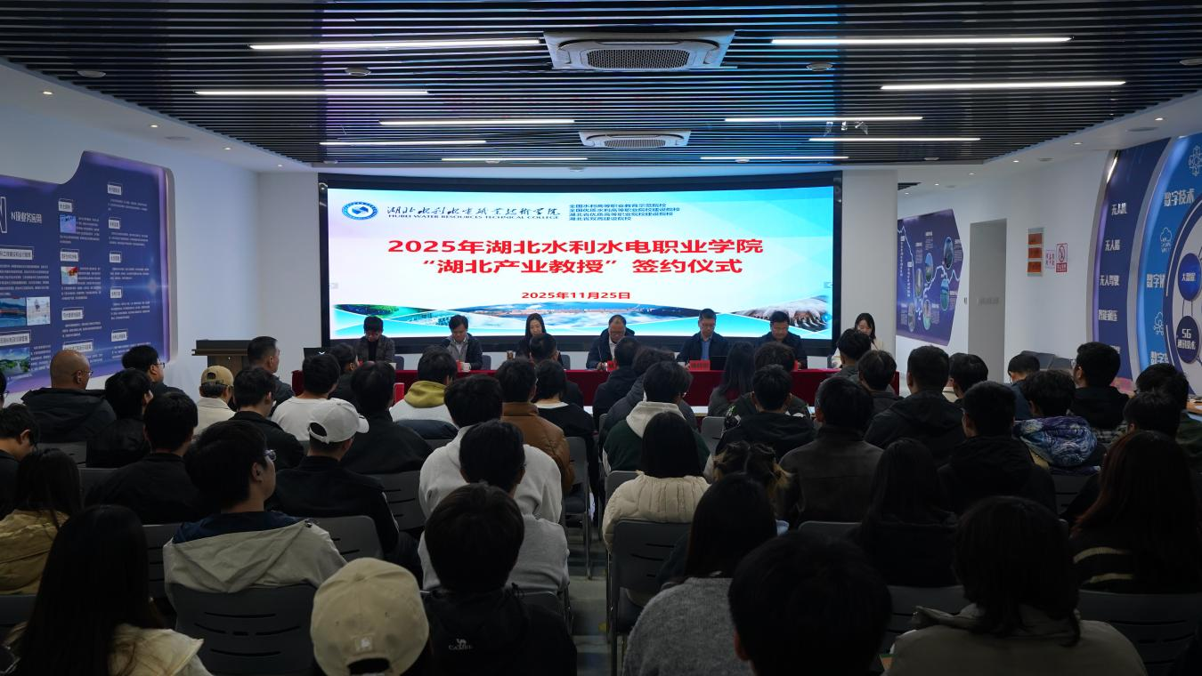 11月25日下午,beat365官网2025年“湖北产业教授”签约仪式暨学术报告会在汤逊湖校区水利楼212智慧水利实训室举行。湖北省水利水电规划勘测设计院有限公司党委委员、副总经理姚晓敏,党委委员、副总经理、工会主席项珺,人力资源部部长李杰,学院党委书记姚祖军,党委委员、人事处处长桂剑萍,水利工程系相关负责人及110名师生共同参加活动。