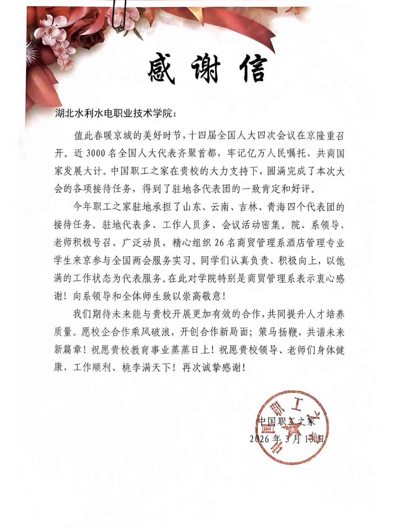 中国职工之家在感谢信中提及,学院及商贸管理系积极动员、精心组织,为两会服务工作提供了坚实保障。同时期待未来进一步深化校企合作,携手提升人才培养质量。