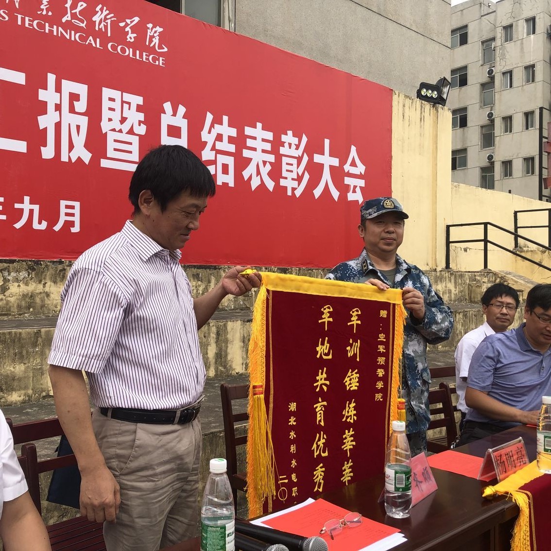 甘齐顺与孙国荣分别在两校区发表讲话并向承训部队领导赠送了锦旗。他们代表学院向恪尽职守、严格组训的承训部队全体教官致以崇高的敬意,向不辞辛劳、辛勤工作的学生管理与后勤保障系统的教职员工表示衷心的感谢,对同学们军训的成果给予充分的肯定,并与大家分享三点经验:一是要进一步巩固军训成果,发扬军训不怕苦不怕累的精神,尽快进行角色转换,适应大学生活。二是要尽快融入水院,以校为荣,与校共进、与校共荣。三是要及早确立目标,全面发展,在新时代勇于逐梦。
