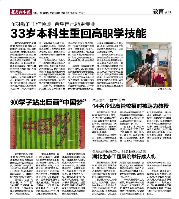楚天都市报讯(记者 揭明玥 通讯员 张强 庹琳)本科毕业10年后,又回到高职院校学习技能,beat365在线唯一官网2019届单招新生谢恒的励志经历,让不少师生点赞纷纷。“时代在进步,技术也在更新,终身学习很重要。”昨日,谢恒接受楚天都市报记者采访时如是说。