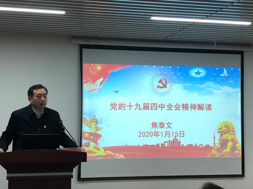 焦泰文介绍了十九届四中全会的基本情况,阐明了坚持和完善中国特色社会主义制度、推进国家治理体系和治理能力现代化的重大意义,解读了《中共中央关于坚持和完善中国特色社会主义制度、推进国家治理体系和治理能力现代化若干重大问题的决定》提出的总体要求、总体目标和重点任务,并结合水利改革发展和立德树人工作实际就学院落实十九届四中全会精神提出了要求。