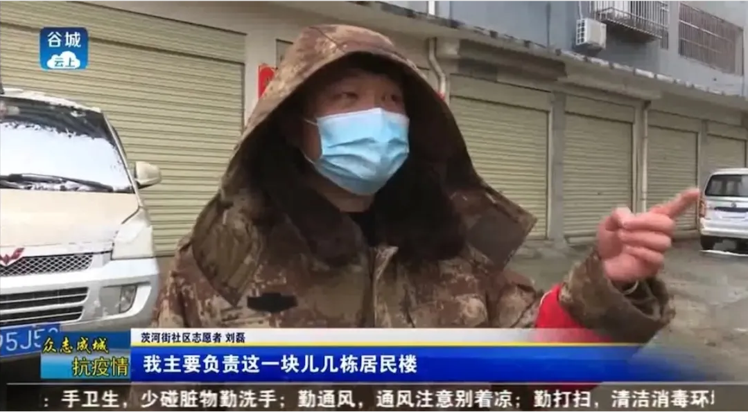 刘磊家住湖北省襄阳市谷城县茨河镇社区,他于2月初正值疫情防控最吃紧的时候看到社区招募疫情工作志愿者的通知,随即主动联系社区居委会申请参加当前疫情防控工作。从2月3日开始,按照社区网格式巡查要求,准时来到执勤点登记过往人员车辆,在出入卡点进行人员消毒、测量体温,向居民发放倡议书、宣传疫情防控知识,提醒村民外出戴口罩以及代购生活物资。同时,他还呼吁身边的亲戚朋友不走亲串友、不信谣、不传谣,积极配合做好当前疫情防控工作。由于工作认真负责,刘磊还被当地电视台采访报导,他说:“作为一名大学生,有责任和义务用自己的方式为家乡抗疫贡献一份力量。”