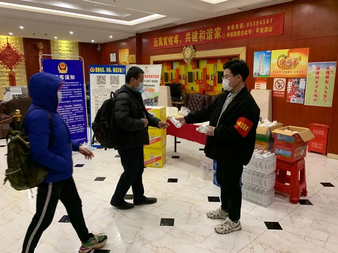 王政乂和张林两位同学,家住武汉。自疫情发生以来,主动请缨到武汉江汉饭店内做志愿服务。该酒店是医护人员的定点休息酒店。两位同学不辞辛苦,负责接待医护人员并做好登记工作,且每天为酒店做店内消毒,给往来医护人员分发物资。他们说:“能够为奋战在抗疫一线的医护人员服务,是我们最大的荣幸。希望通过我们的工作,能够为医护人员提供一个安全舒适的休息环境。”
