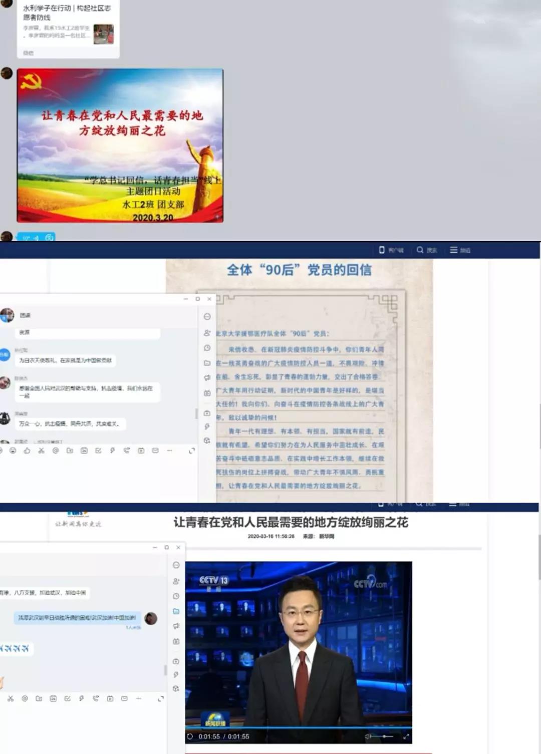 以深入学习贯彻3月15日习近平总书记给北京大学援鄂医疗队全体“90后”党员回信精神为主要内容,开展“学总书记回信,话青春担当”线上主题团日活动。本次主题团日活动,由院团委统一安排,各系分团委书记牵头,各团支部书记精心组织,通过视频会议、网络通话、观看PPT和视频等各种形式,实现了beat365官网所有团支部全覆盖,引发了广大团员青年的热烈反响。水院学子以分享抗疫事迹、书法绘画、诗歌朗诵、短视频等多种方式,深入学习回信精神,抒发拳拳爱国热忱。