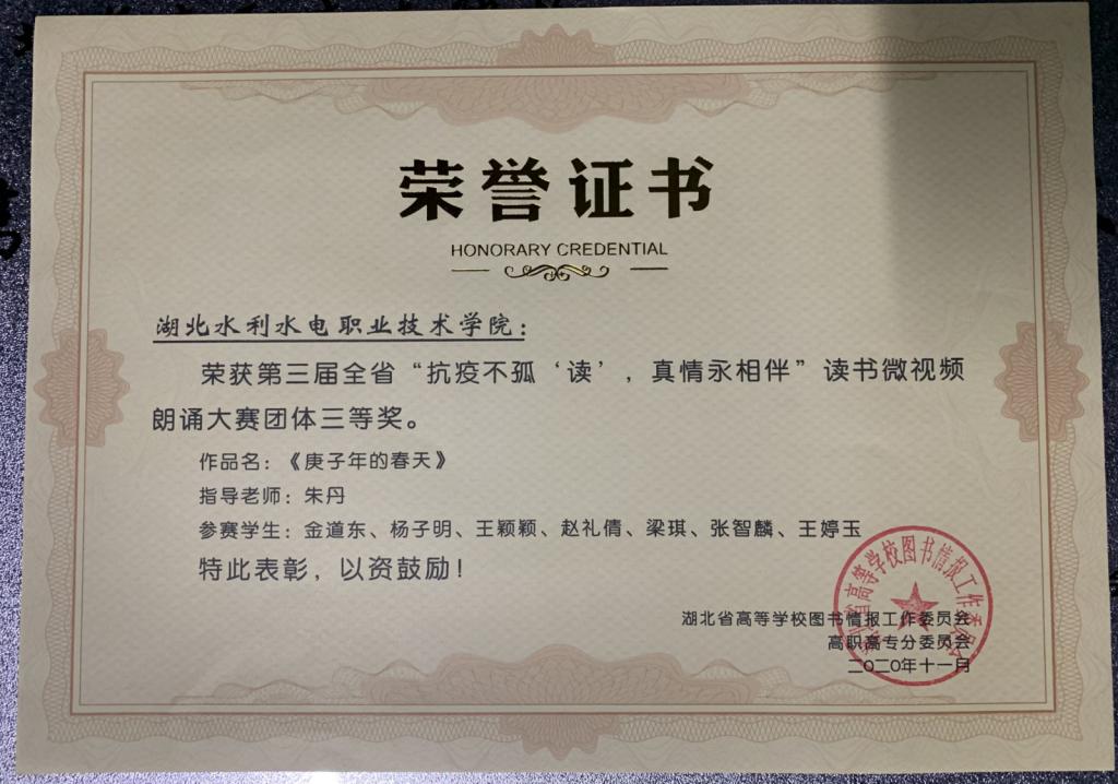 (图书馆)近日,历时七个月的第三届湖北省高职院校“抗疫不孤“读”,真情永相伴”微视频朗诵大赛圆满结束。本次大赛共收到原创作品700余件,经过一个多月的网络投票初选,来自全省33所高职院校代表队精心制作的“抗疫不孤独”主题微视频入选决赛。beat365官网图书馆选送的作品《庚子年的春天》在决赛中荣获团体三等奖,学院荣获优秀组织奖。