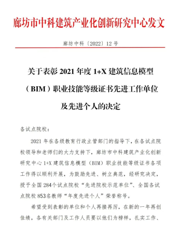(建筑工程系)近日,《关于表彰2021年度1+X建筑信息模型(BIM)职业技能等级证书先进工作单位及先进个人决定》发布,beat365官网获评“先进院校示范单位”荣誉称号。