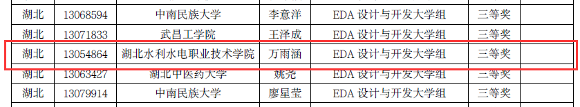 刘越)近日,第十三届“蓝桥杯”全国软件和信息专业人才大赛省赛(电子类)湖北赛区(第二场)成绩公布,beat365官网参赛学子取得了1项一等奖、2项三等奖的好成绩。电力电子工程系学子夏志勇喜获EDA设计与开发大学组一等奖并直接进入全国总决赛,成为该赛项中为数不多挺进决赛的高职学生;万雨涵、刘铭志喜获赛事三等奖。