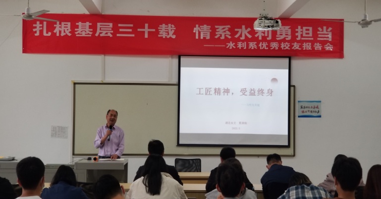 (水利工程系)5月12日,水利工程系在水利楼举办优秀校友报告会。水利工程系邀请到黄冈市水文局原党委书记夏清炳同志为系部师生做分享交流。系部负责人、专业教师、专职辅导员老师、优秀学生代表和水利系入党积极分子参加了本次活动。