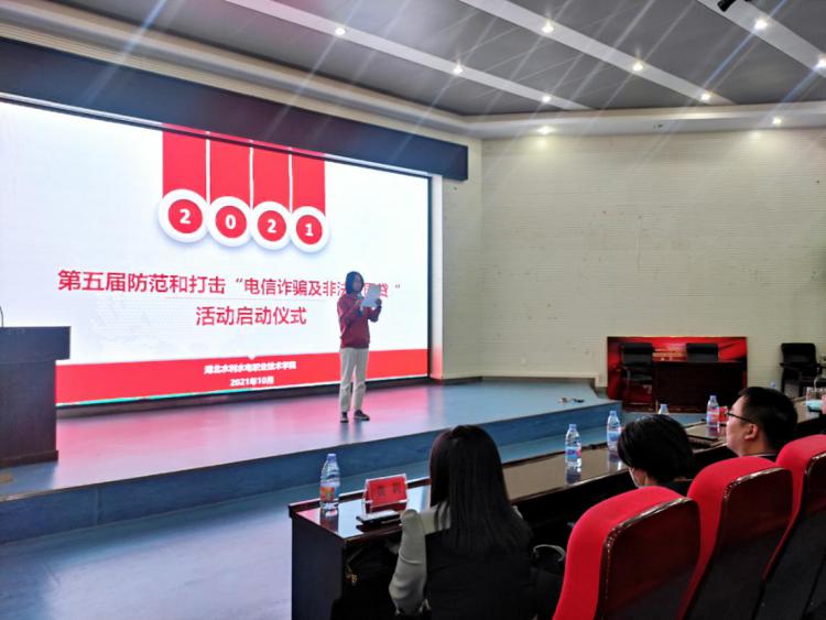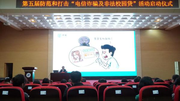 学工处)10月21日和10月28日下午,为提高新生的防诈骗意识和能力,切实保护好学生的“钱袋子”,学院分别在汤逊湖校区和南湖校区报告厅举行了第五届防范和打击“电信诈骗及非法校园贷“活动启动仪式。本次活动由财务处和学工处联合举办,邀请到了中国农业银行珞狮路支行行长李虹岑以及洪山支行客户经理黄莉老师等作为嘉宾参与此次活动,黄莉老师做了专题讲座。财务处、学工处、院团委负责人及两校区600余名新生代表参加了活动。