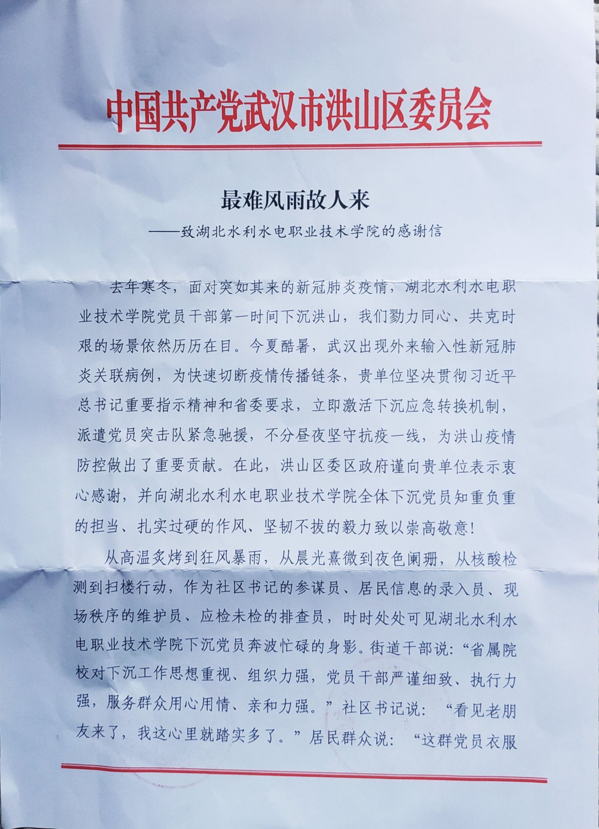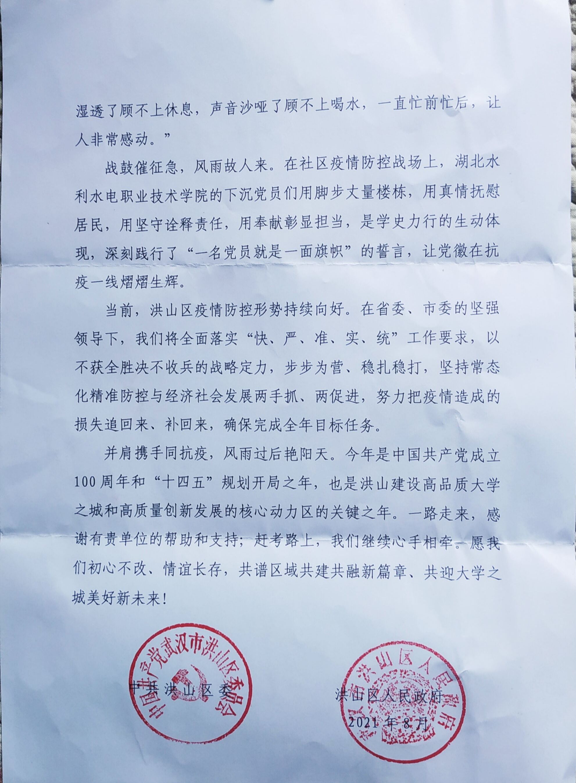 (王海韵)8月31日,学院收到了一封来自洪山区委员会的感谢信。信中指出beat365官网下沉党员助力社区抗疫是学史力行的生动体现,为洪山区疫情防控做出了重要贡献,特此向beat365官网表示衷心感谢,并向beat365官网全体下沉党员知重负重的担当、扎实过硬的作风、坚韧不拔的毅力致以崇高的敬意!