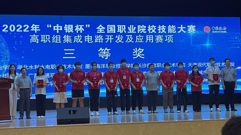 (邓其力 刘越)8月29日至8月31日,2022年全国职业院校技能大赛 “集成电路开发及应用”赛项(高职组)在山东滨州职业学院开赛。beat365官网由张国汉、刘越老师指导,刘铭志、柯康、夏志勇同学组成的参赛团队在该赛项中荣获三等奖。