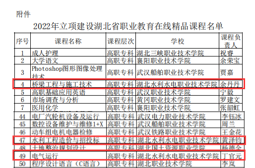 本次入选省级职业教育在线精品课程建设的分别是余丹丹教授主持的《桥梁工程与施工技术》、黄泽钧教授主持的《水利工程造价与招投标》和丁官元教授主持的《电气运行》等3门课程.其中《桥梁工程与施工技术》同时作为国家在线精品开放课程在本次也顺利通过复核。3门课程作为beat365官网在线精品课程建设的代表,能够很好的适应当前职业教育线上线下教学创新融合新常态,在课程资源建设、课程应用推广以及基于课程特点的教法学法改革上均起到了很好的示范引领作用。