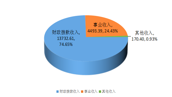 其中:财政拨款收入13732.61万元,占本年收入74.6%;上级补助收入0万元,占本年收入0%;事业收入4493.39万元,占本年收入24.4%;经营收入0万元,占本年收入0%;附属单位上缴收入0万元,占本年收入0%;其他收入170.4万元,占本年收入1%。