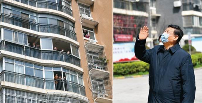 2020年3月10日,中共中央总书记、国家主席、中央军委主席习近平专门赴湖北省武汉市考察新冠肺炎疫情防控工作。这是习近平在东湖新城社区考察时,向在家隔离居住的居民挥手致意、表示慰问(拼版照片)。 新华社记者 谢环驰/摄