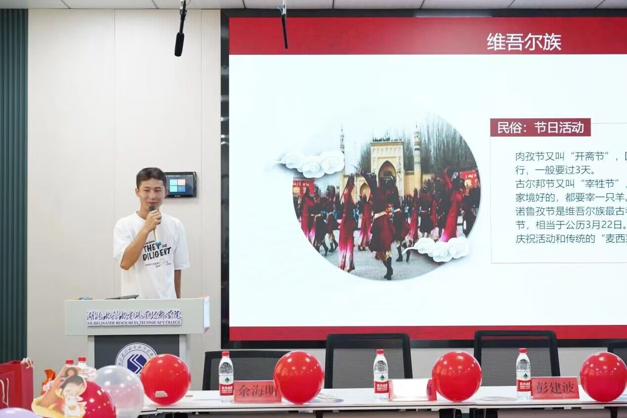会议伊始,各民族学生代表依次介绍了本民族的传统习俗、美食、文化等内容,向大家展现了各民族之间不同的文化与风俗习惯,同时谈了自己来到湖北水院的初印象,也对大学生活做了初步规划和展望。少数民族辅导员达娃拉珍代表学院全体教师向大家带来节日的祝福和问候,并叮嘱全体同学要爱国爱党,铸牢中华民族共同体意识,积极参加班级和院系组织的各类文体活动,努力提升集体融入度。