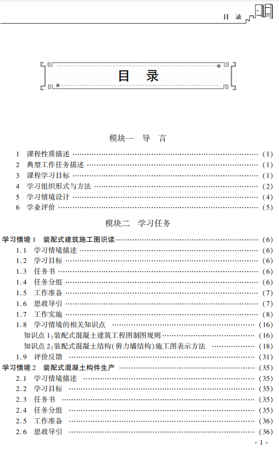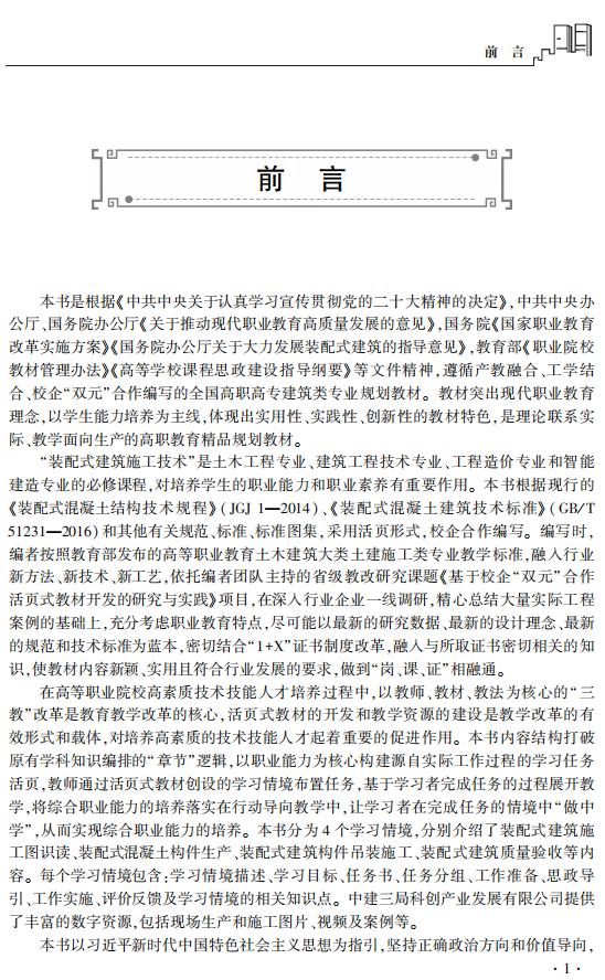 本教材立足装配式建筑行业前沿,创新采用活页式设计,支持知识动态更新,确保教学内容与技术发展同步。教材深度融合岗位需求与行业标准,依据国家最新规范及“1+X”职业技能等级标准构建模块化课程体系,内容覆盖装配式建筑全生命周期的核心环节,通过嵌入“1+X”实训模块,采用“任务驱动案例教学”方法,帮助学生在掌握理论知识同时提升实践能力,并兼顾考证需求。