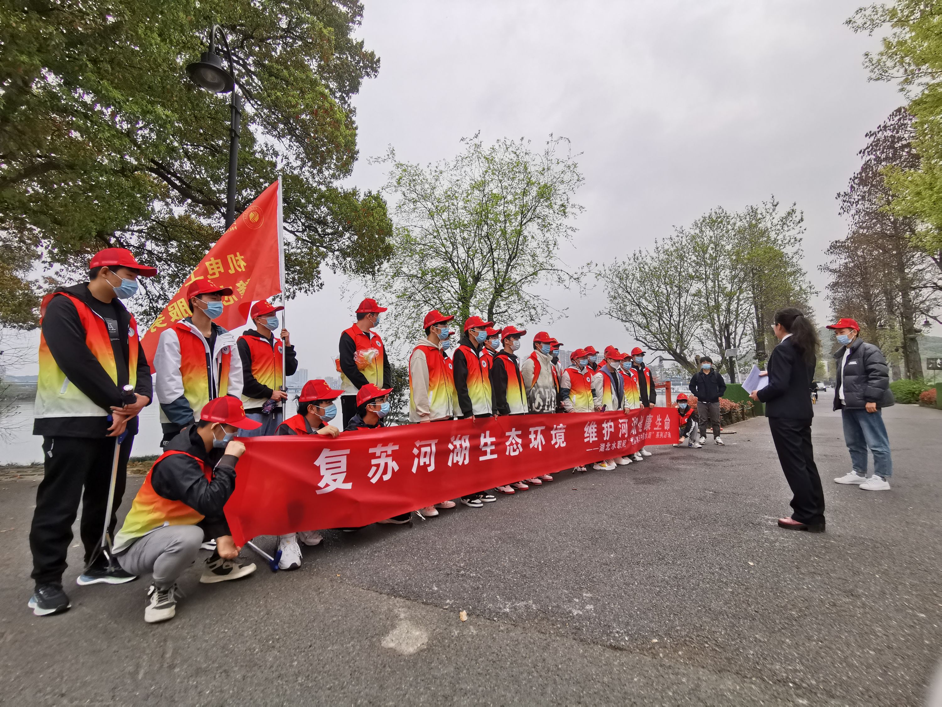 在东湖畔,青年学生正在开展志愿巡湖活动。