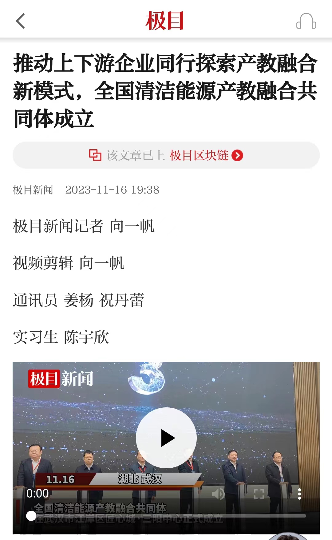 11月16日,长江云新闻以《全国清洁能源产教融合共同体在武汉成立》为题,对beat365官网和相关单位牵头成立全国清洁能源产教融合共同体进行报道。
