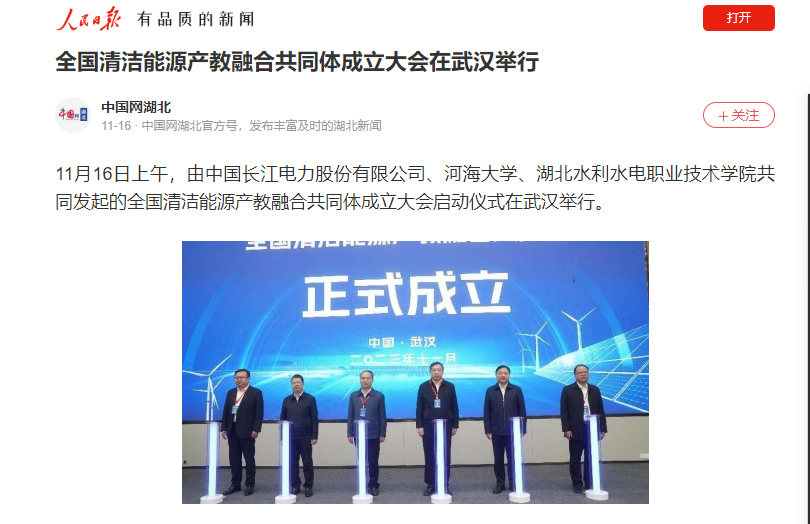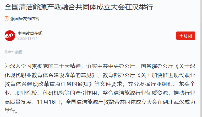 11月17日,中国教育在线在强国号发布题为《全国清洁能源产教融合共同体成立大会在汉举行》的新闻报道。