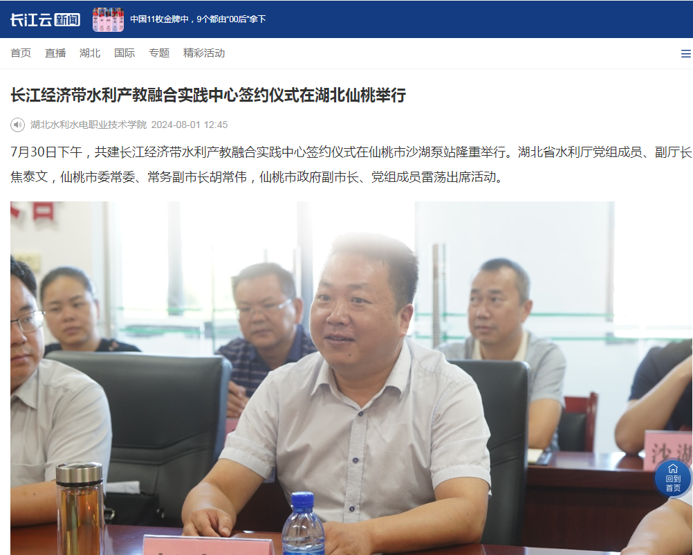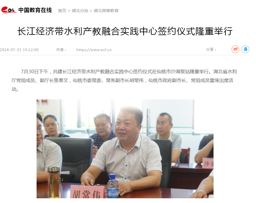 8月1日,长江云以《长江经济带水利产教融合实践中心签约仪式在湖北仙桃举行》为题进行报道。