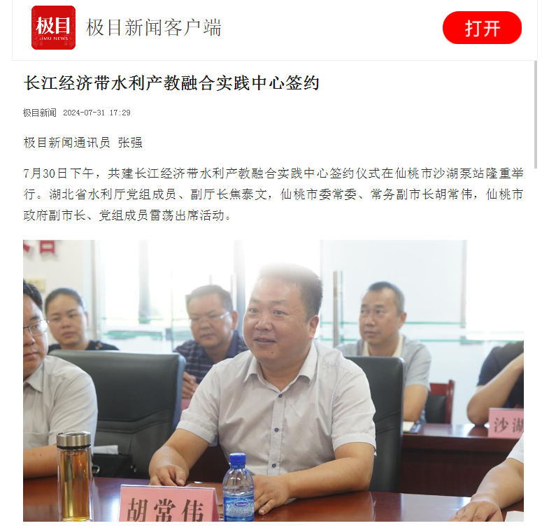 7月31日,极目新闻以《长江经济带水利产教融合实践中心签约》为题进行报道。