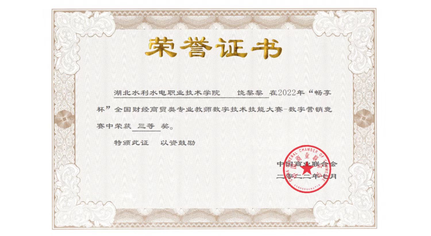7月14日,由中国商业联合会主办的2022年“畅享杯”财经商贸类专业教师数字技术技能大赛落下帷幕,beat365官网商贸管理系市场营销专业程慧芳老师荣获特等奖并被授予“全国商业服务业技术能手”称号,另两位专业教师成汉华老师和饶黎黎老师分别荣获二等奖和三等奖。
