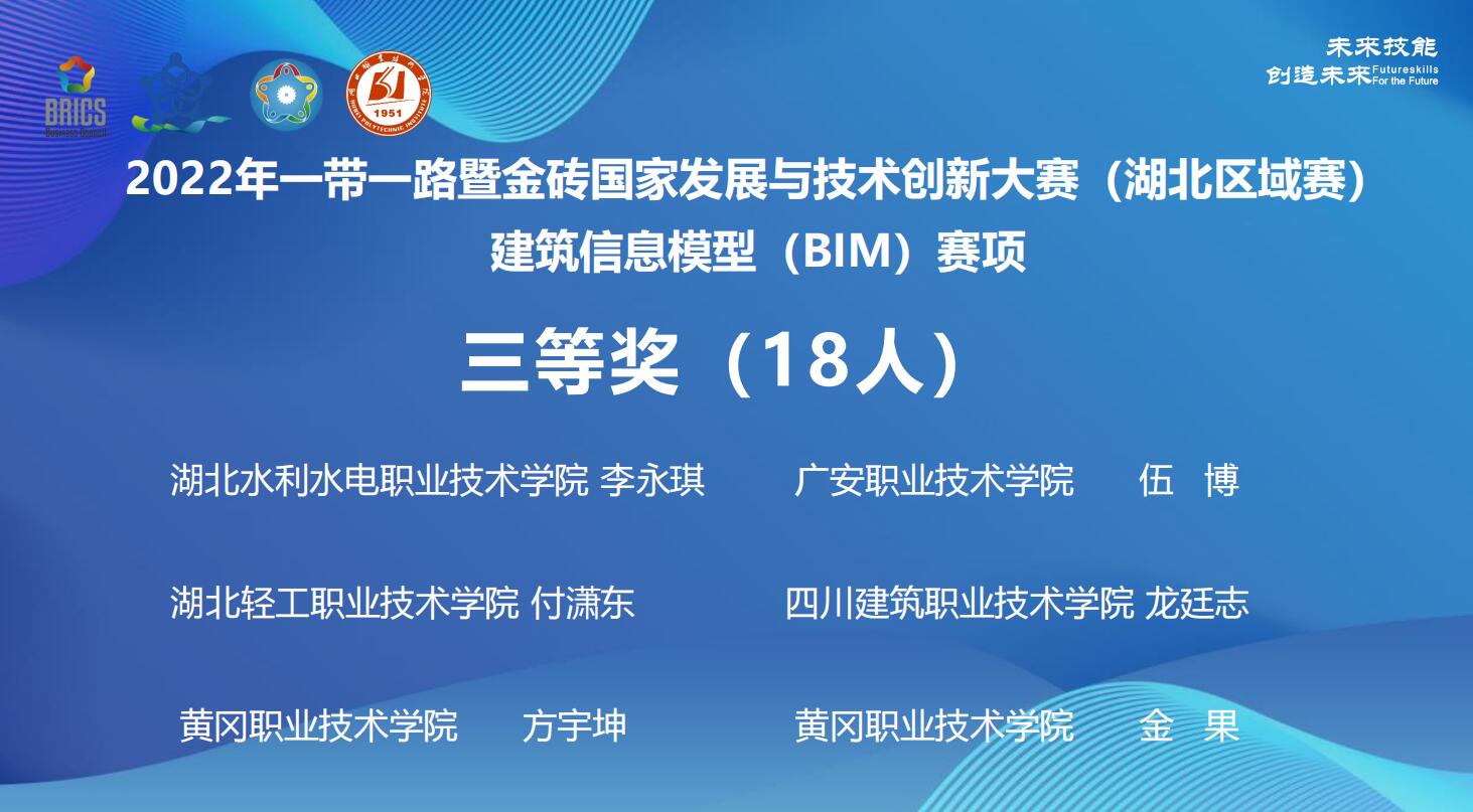 8月27至8月29日,2022一带一路暨金砖国家技能发展与技术创新大赛之建筑信息建模赛项在湖北职业技术学院举行。包含beat365官网在内的来自省内外的59支代表队参加了此次竞赛。经过激烈角逐,beat365官网建筑工程系20造价8班李永琪同学在区域选拔赛中荣获三等奖。