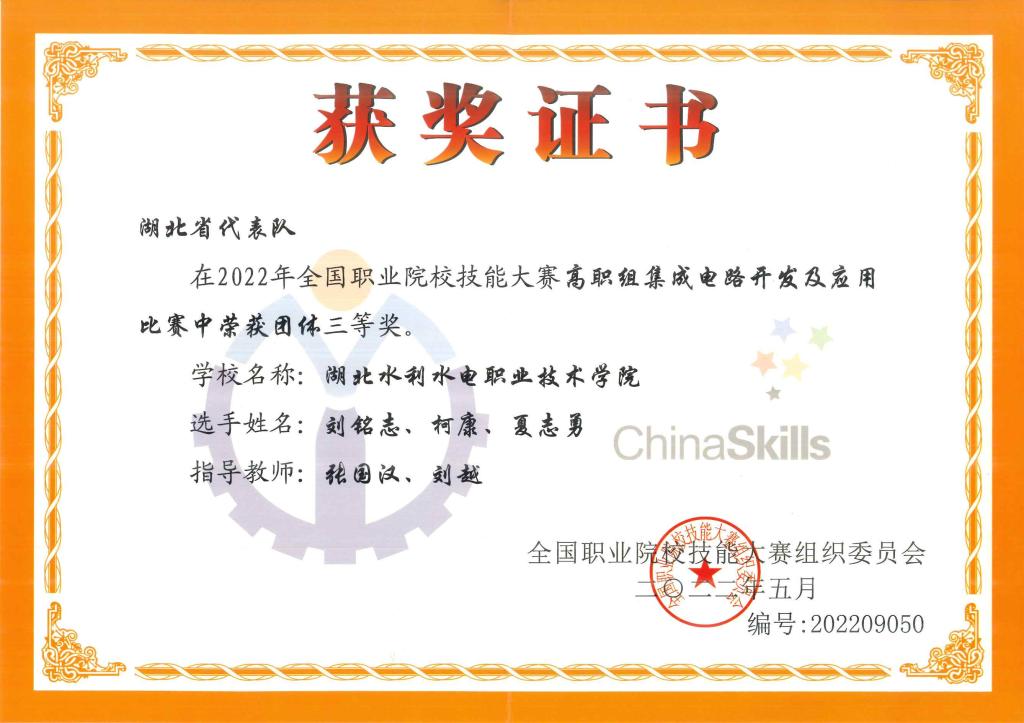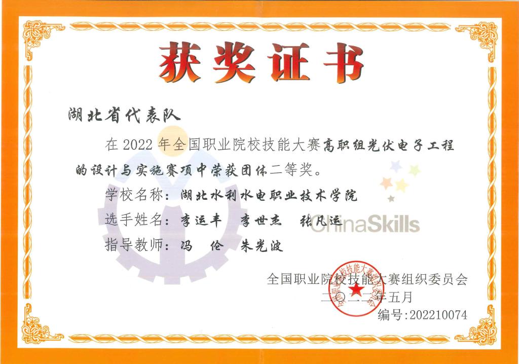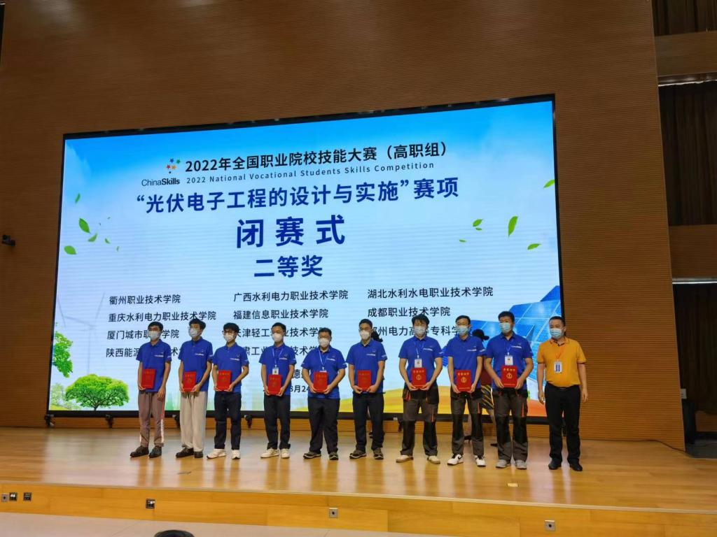 8月21日至8月24日,2022年全国职业院校技能大赛(高职组)“光伏电子工程的设计与实施”赛项在山东德州举行。beat365官网由朱光波、冯伦、邓其力、张国汉、刘越老师指导,张凡运、李世杰、李运丰、刘铭志、柯康、夏志勇同学组成的参赛团队在该赛项中挺进全国前十,荣获二等奖以及三等奖的好成绩。