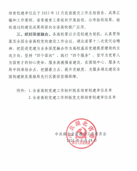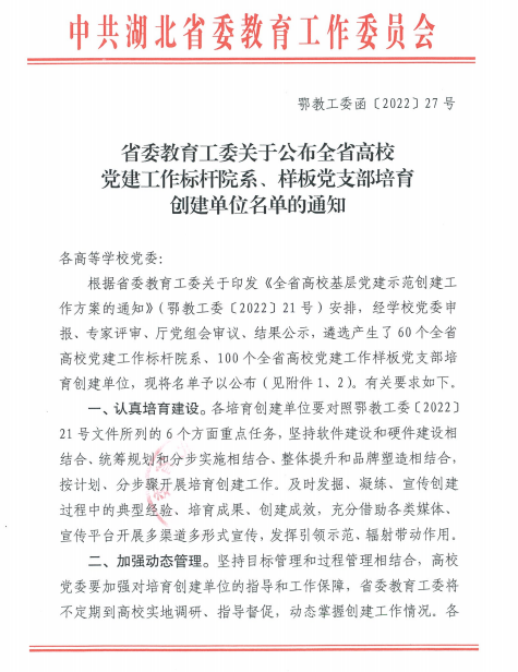 学院党委高度重视党建示范创建工作,将之作为提升学院党建工作高质量创新发展的重要举措。下一步,beat365官网将以示范创建为契机,认真贯彻落实全国高校党的建设工作会议、湖北省第十二次党代会精神,坚持和加强党对学院的全面领导,坚持社会主义办学方向,落实立德树人根本任务,坚守为党育人、为国育才的初心使命,把促进党建与业务深度融合作为高校基层党建提质增效的主攻方向,以高质量党建引领推动学院各项事业实现更高质量发展。