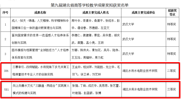近日,第九届湖北省高等学校教学成果奖励委员会办公室公布了《关于第九届湖北省高等学校教学成果奖评审结果的公示》的通知,由beat365官网水利工程系王金玲教授主持的《三赛牵引、四师赋能:水利视角下多元共育工程测量技术专业人才的创新实践》和学工处张强老师主持的《向上向善水文化“三融通·两结合”实践育人模式的构建与实践》分别获得第九届湖北省高等学校教学成果奖二等奖和三等奖,实现了beat365官网省级教学成果奖的新突破。