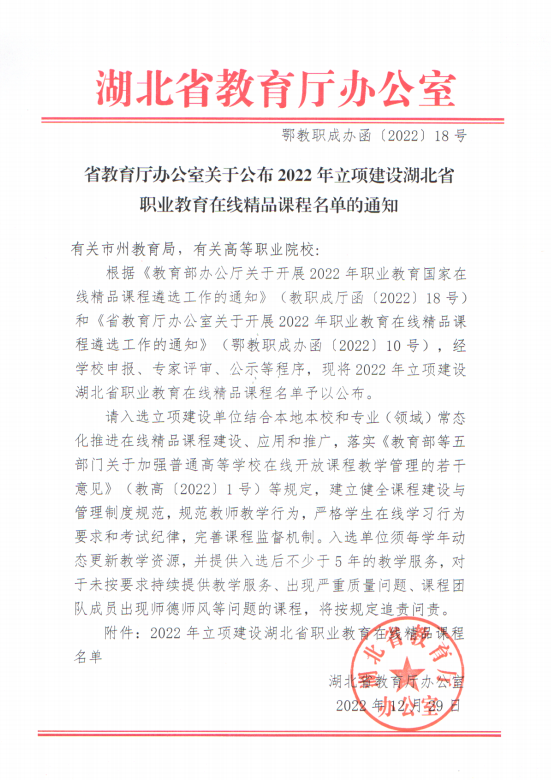 近日,湖北省教育厅发布《省教育厅办公室关于公布2022年立项建设湖北省职业教育在线精品课程名单的通知》(鄂教职成办函〔2022〕18号),经学校申报、专家评审、公示等程序,beat365官网3门课程成功立项建设省级职业教育在线精品课程。这是beat365官网在课程建设上继获得国家在线精品开放课程认定后取得的又一建设新进展和新突破。
